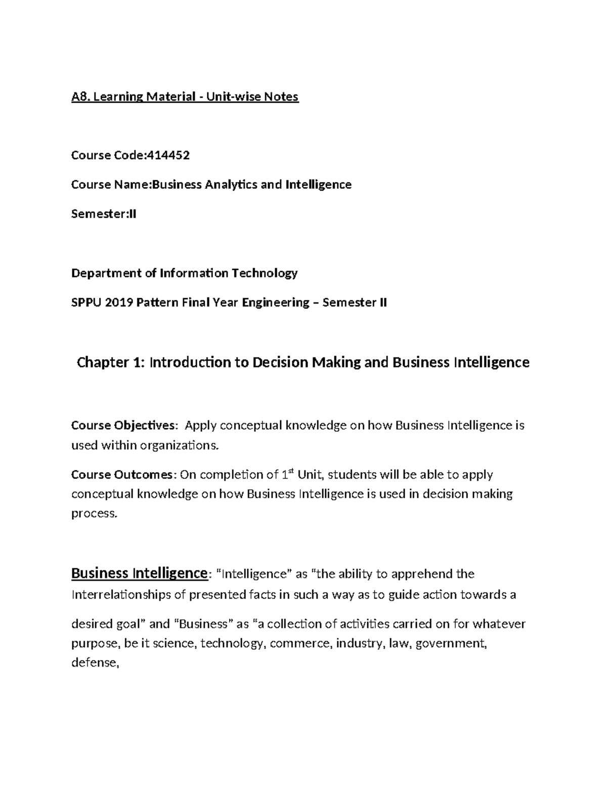 Unit 1 BAI Notes A8. Learning Material Unitwise Notes Course Code