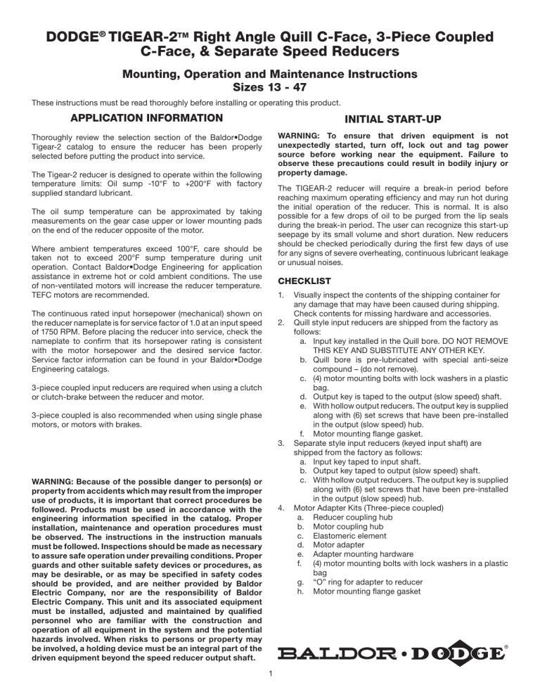 DODGE TIGEAR2 Reducer Mounting & Operation Manual