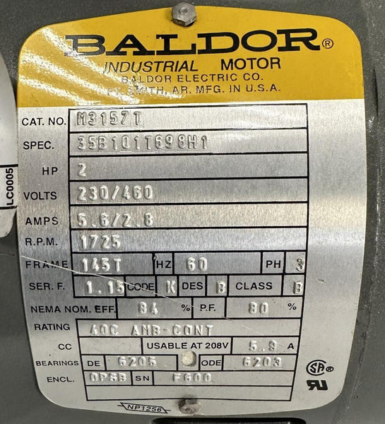 Baldor M3157T AC Motor 2 HP 1725 RPM 145T 230/460V 3 Phase