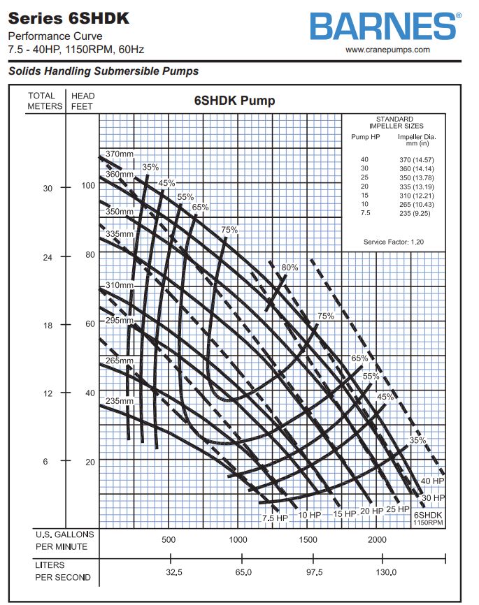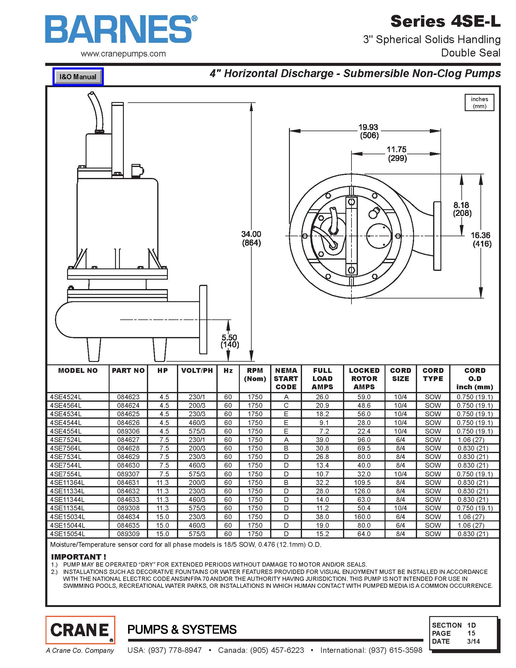 115369 Barnes Submersible Effluent Pumps (SP75AX Catalog Number, 3/4 HP