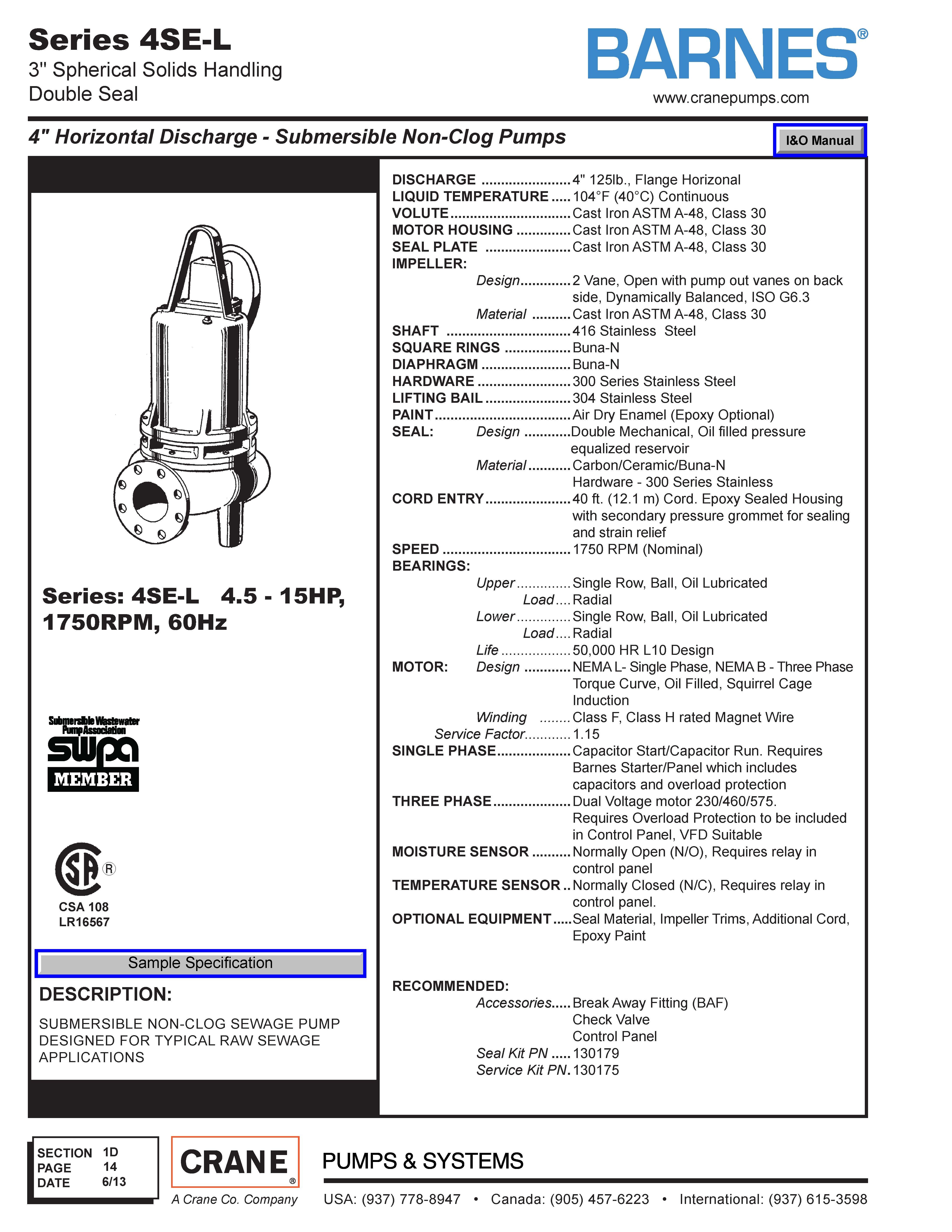 BARNES 4SE11334HL Submersible Solids Handling Pump User Guide
