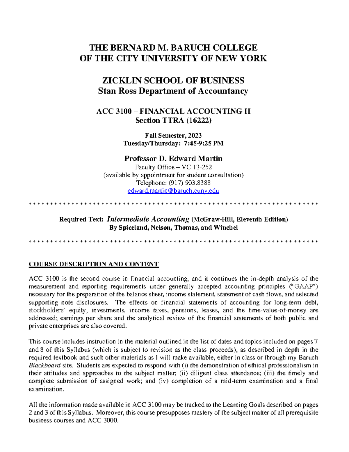 Baruch College Syllabus. ACC 3100. Fall 2023 THE BERNARD M. BARUCH