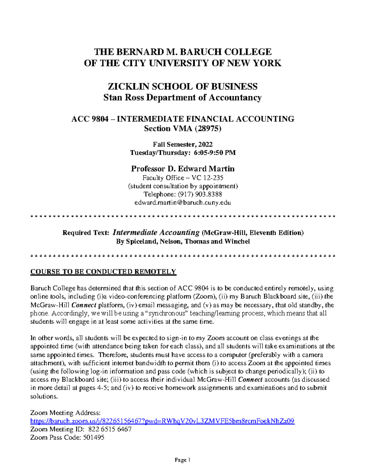 Baruch College Syllabus. ACC 9804. Fall 2022 THE BERNARD M. BARUCH