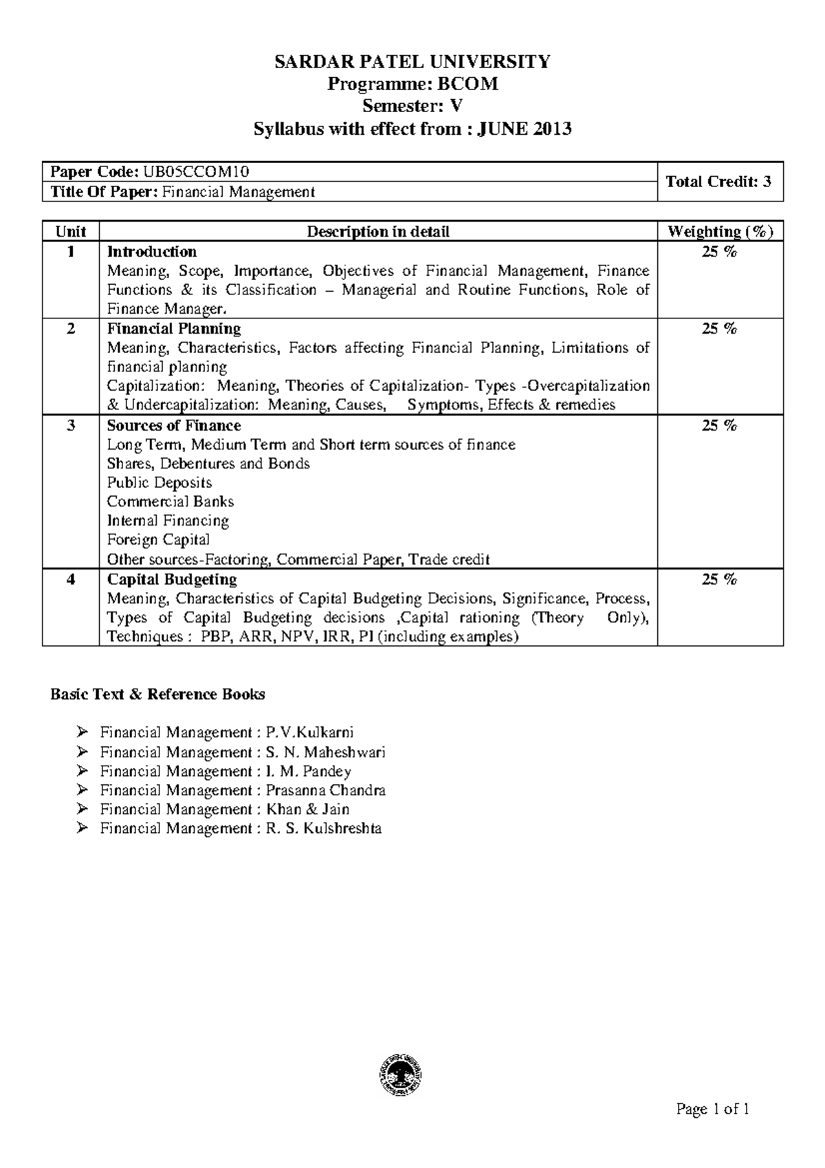 Financial Management Page 1 of 1 SARDAR PATEL UNIVERSITY