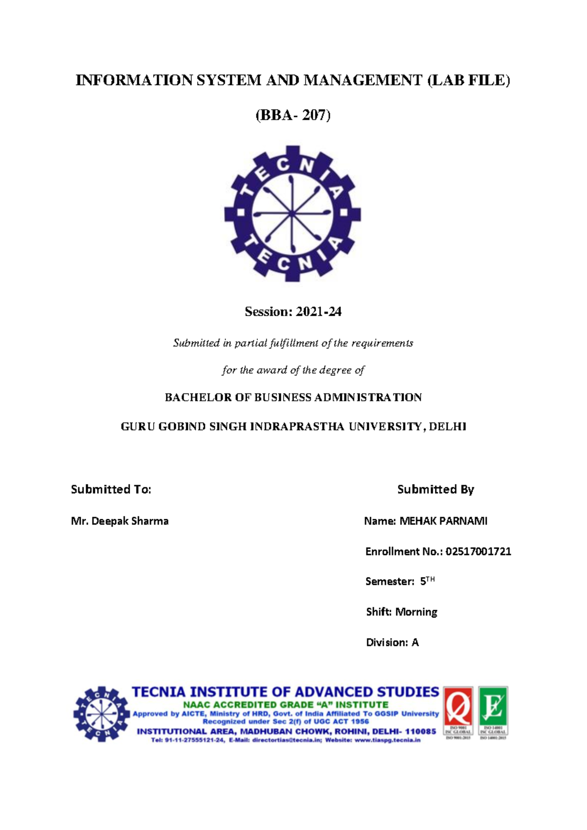 Mehak Parnami's ISM File INFORMATION SYSTEM AND MANAGEMENT (LAB FILE