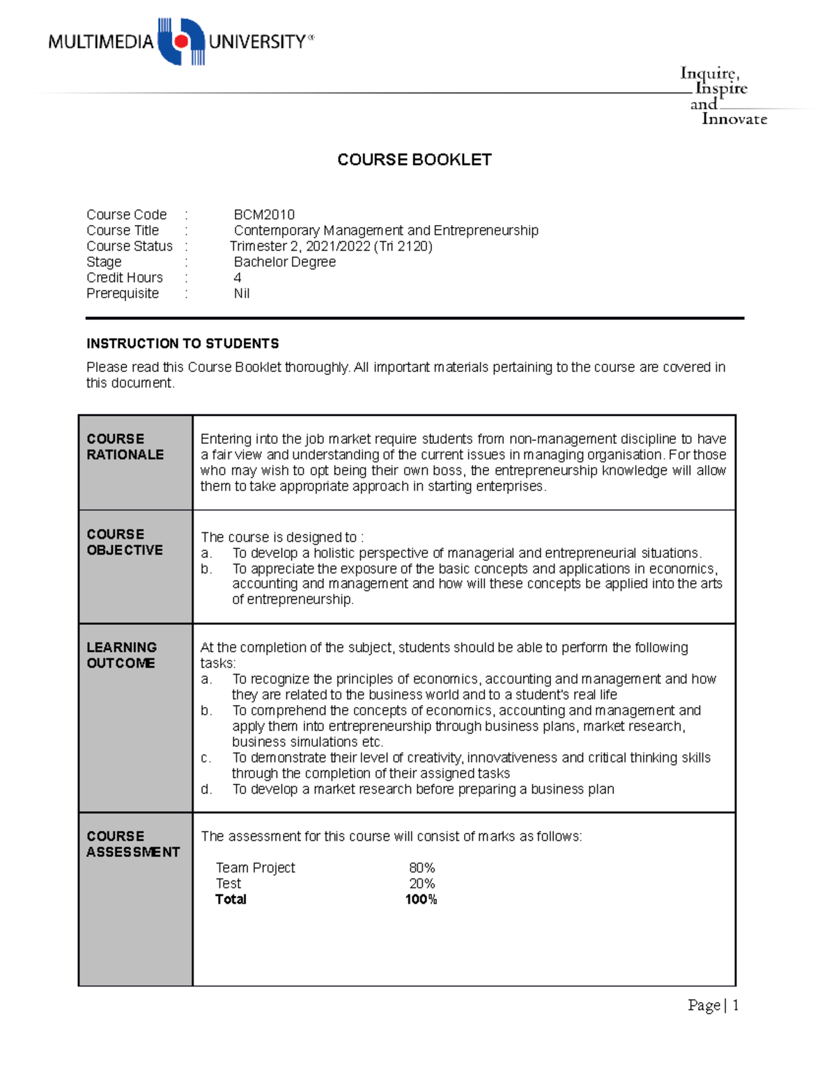 BCM2010 Coursework Booklet Sem (Tri, 2120) COURSE BOOKLET Course Code