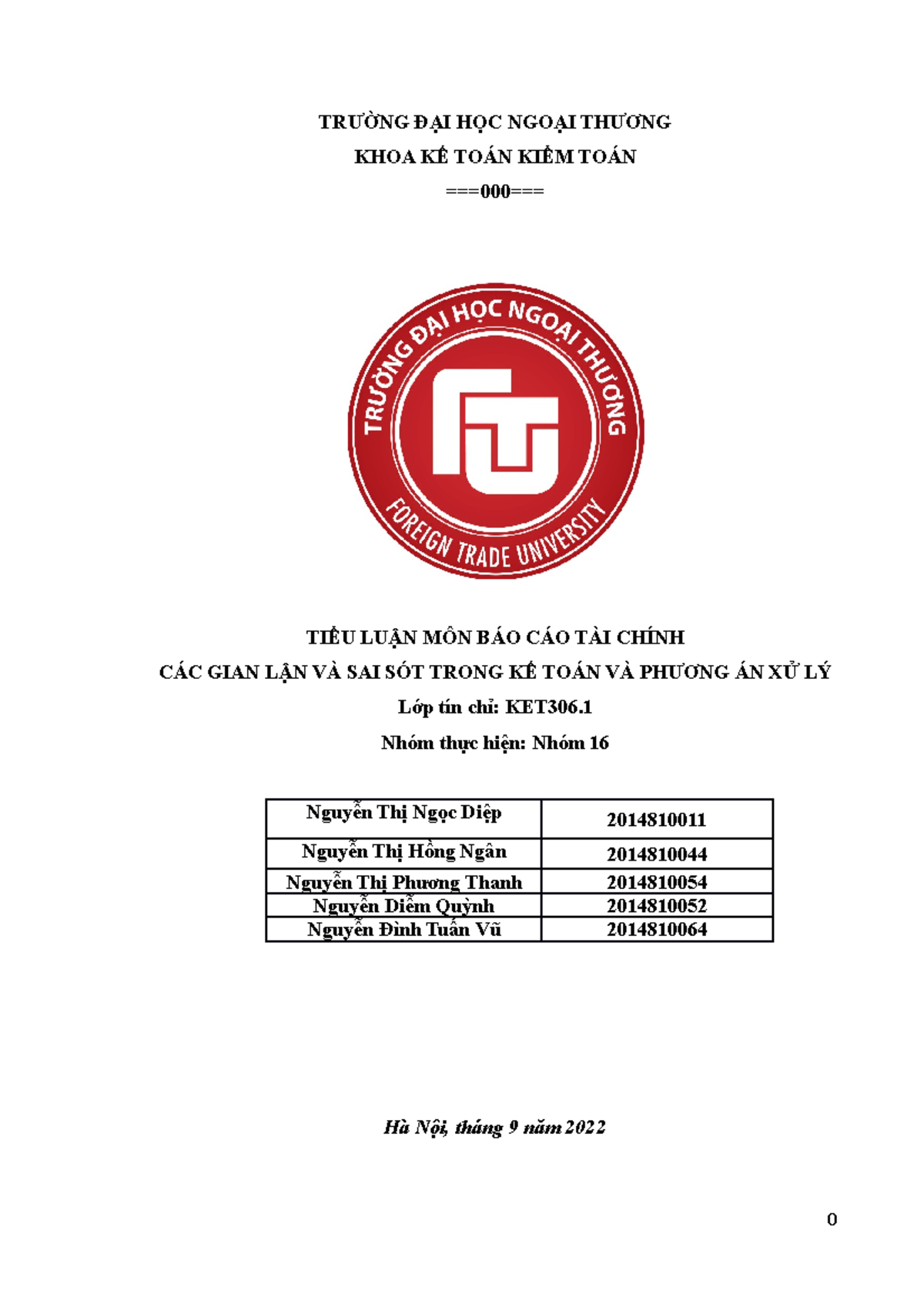 BCTCoutline rủi ro kế toán trong BCTC TRƯỜNG ĐẠI HỌC NGOẠI THƯƠNG