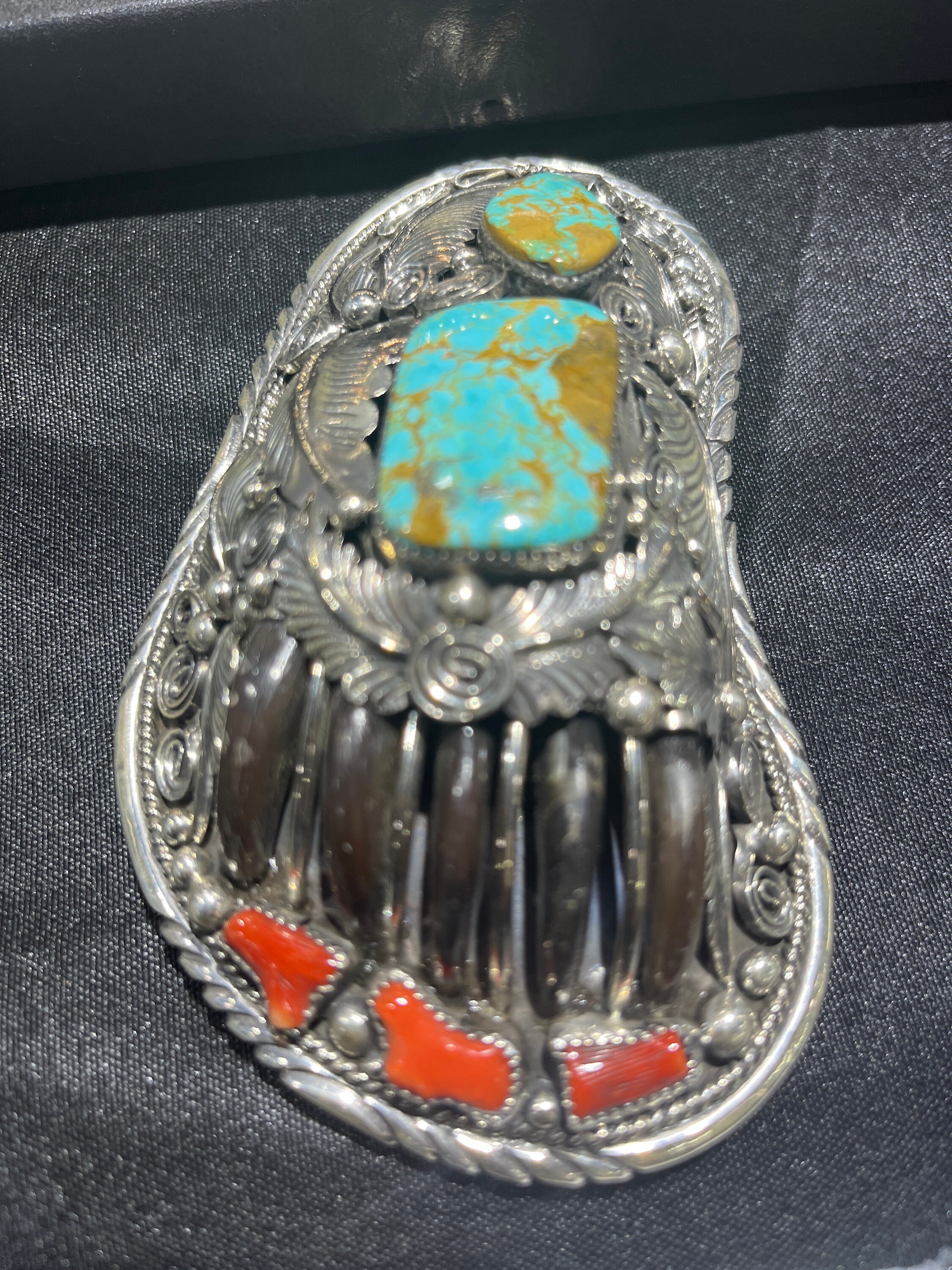 Sterling Navajo Turquoise Coral Bear Claw Belt Buckle 20225