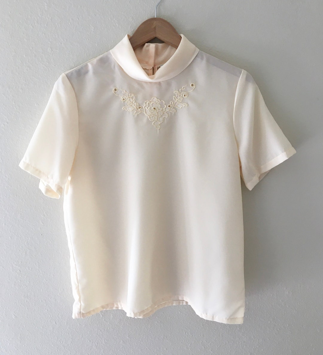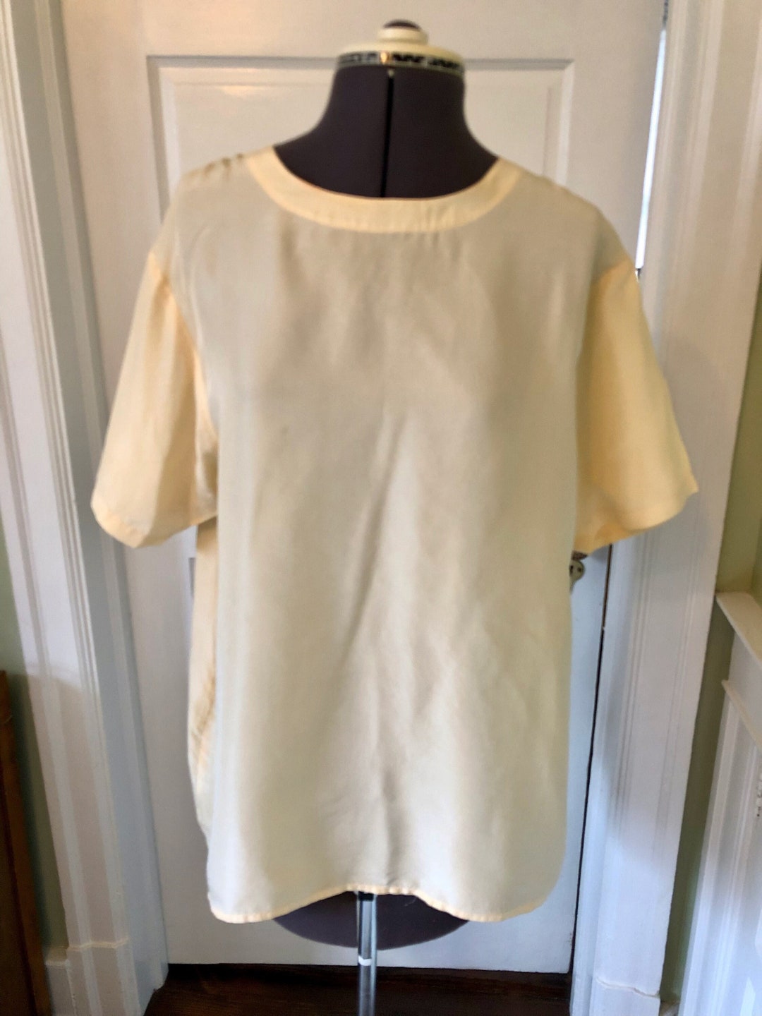 70s Pale Gold Silk Short Sleeved Blouse With Crew Neckline With Back