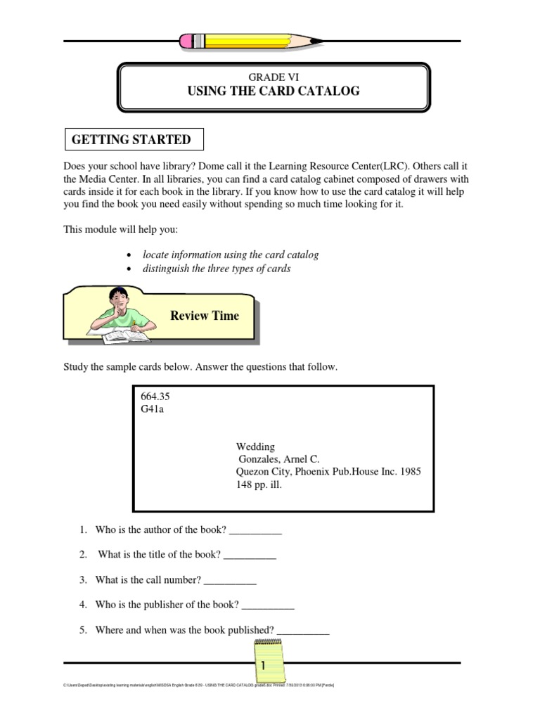 Using The Card Catalog Grade6 PDF Library Science Libraries