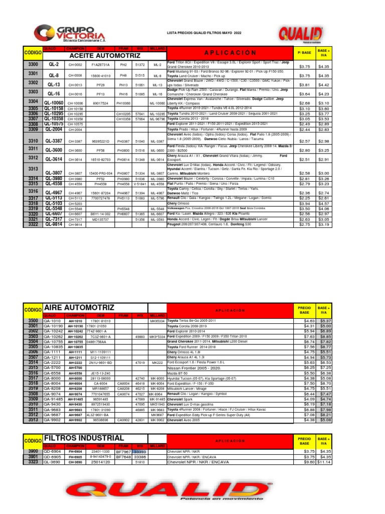 List of Filter Prices from Qualid May 2022 Concise catalog of