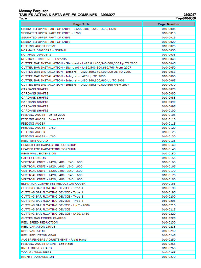 Massey Ferguson Grain Headers Activa&Beta Parts Catalog Manual