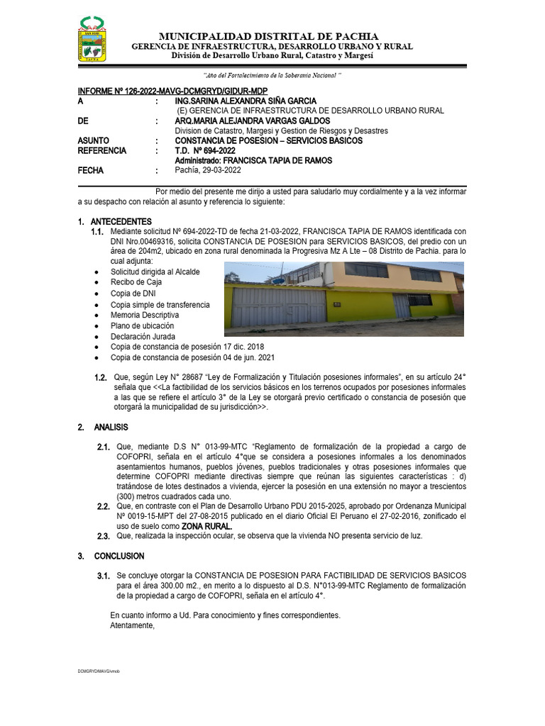 Inf 1262022 Constancia de Posesion Francisca Tapia de Ramos PDF