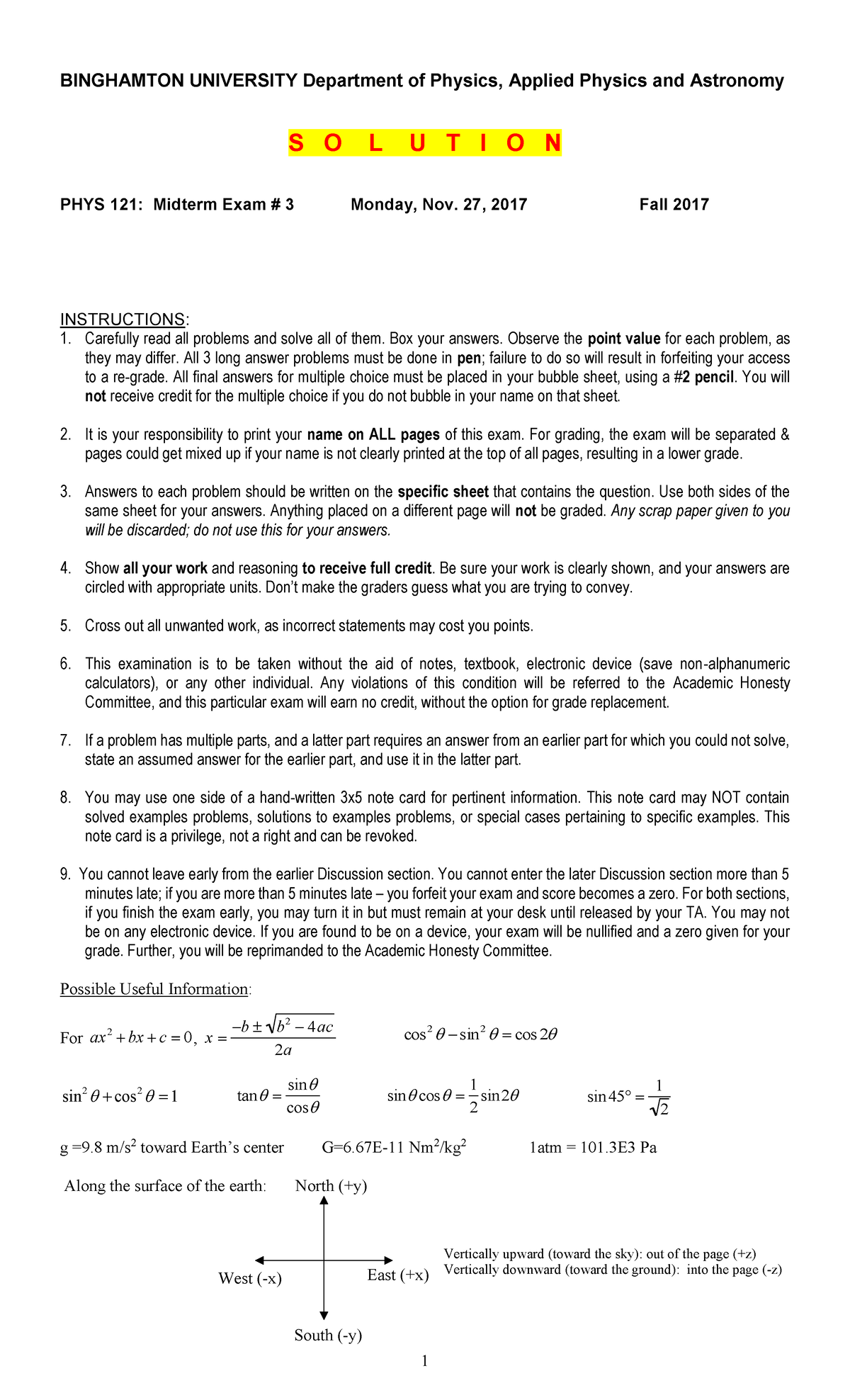 Fall 2017 exam SOLUTIONS BINGHAMTON UNIVERSITY Department of Physics