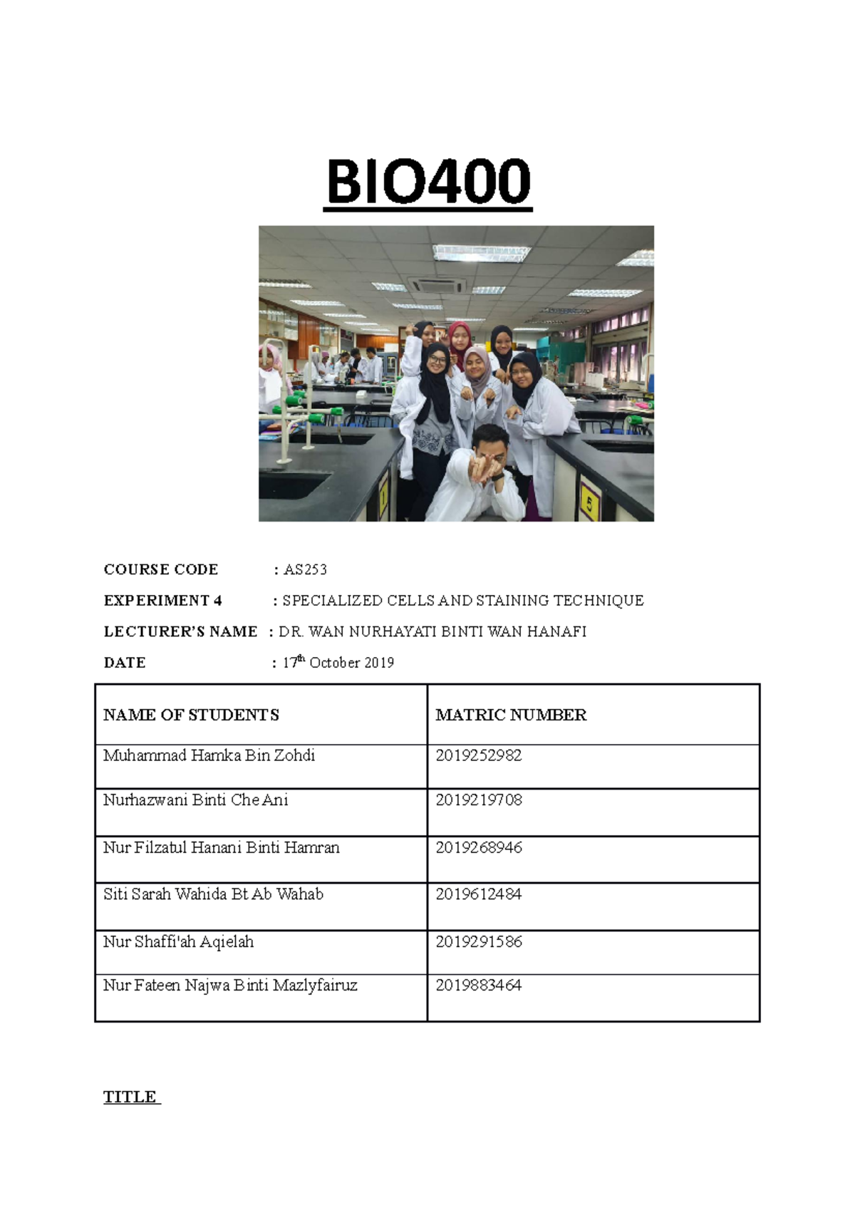 LAB Report BIO400 BIO COURSE CODE AS EXPERIMENT 4 SPECIALIZED