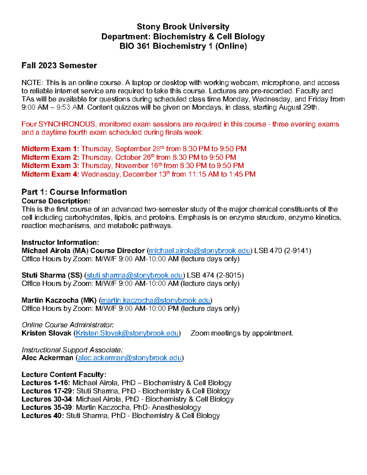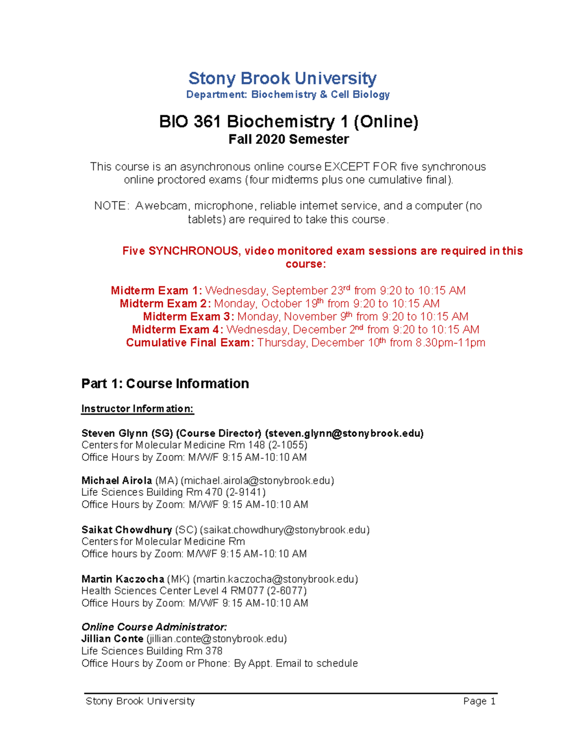 BIO 361 Syllabus and Course Schedule Fall 20 Final Stony Brook