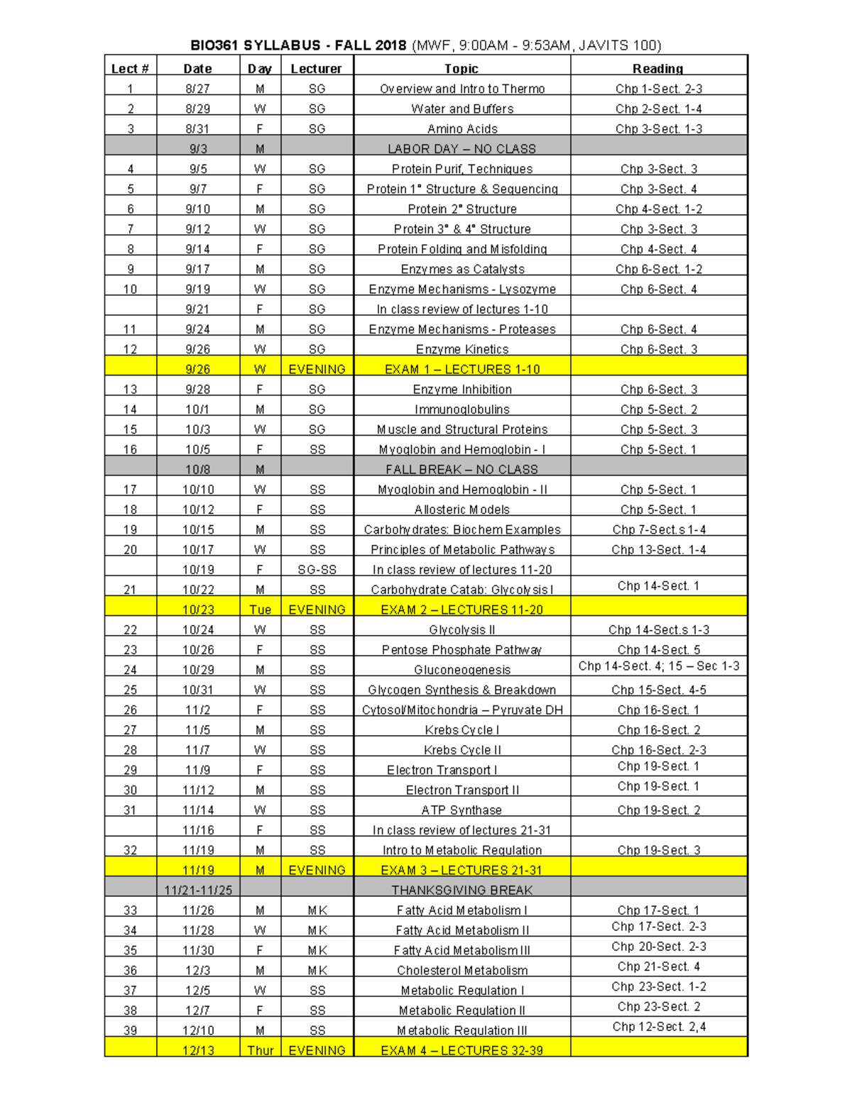 BIO361Syllabus 2018 Syllabus BIO361 SYLLABUS FALL 2018 (MWF, 9