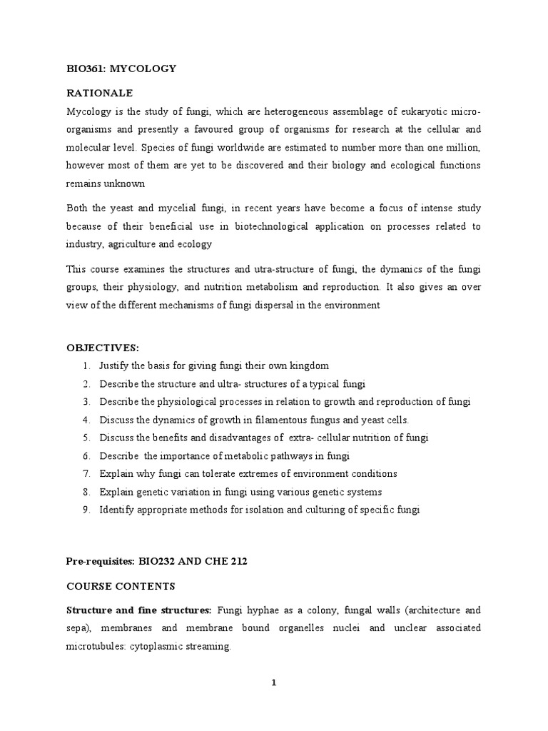 BIO361 MYCOLOGY Course Outline PDF Fungus Yeast