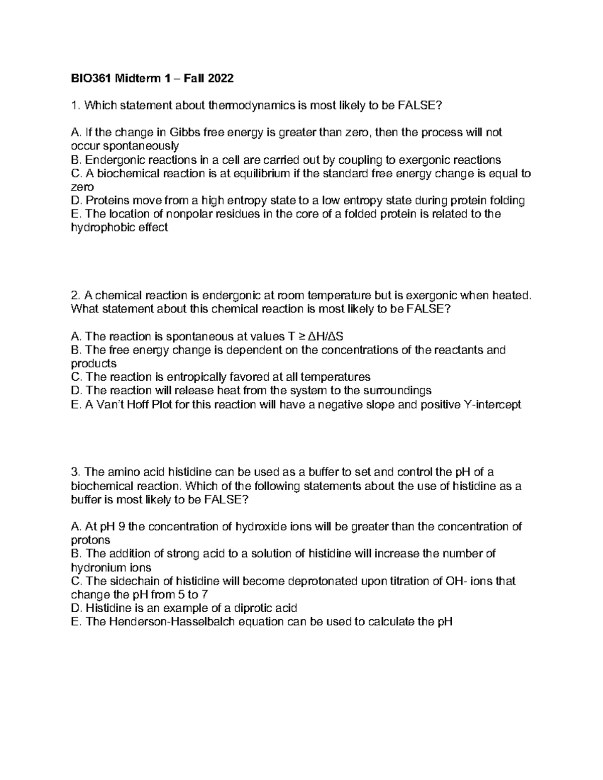 BIO361 Fall 2022 Midterm 1 Study Guide on Thermodynamics and Proteins