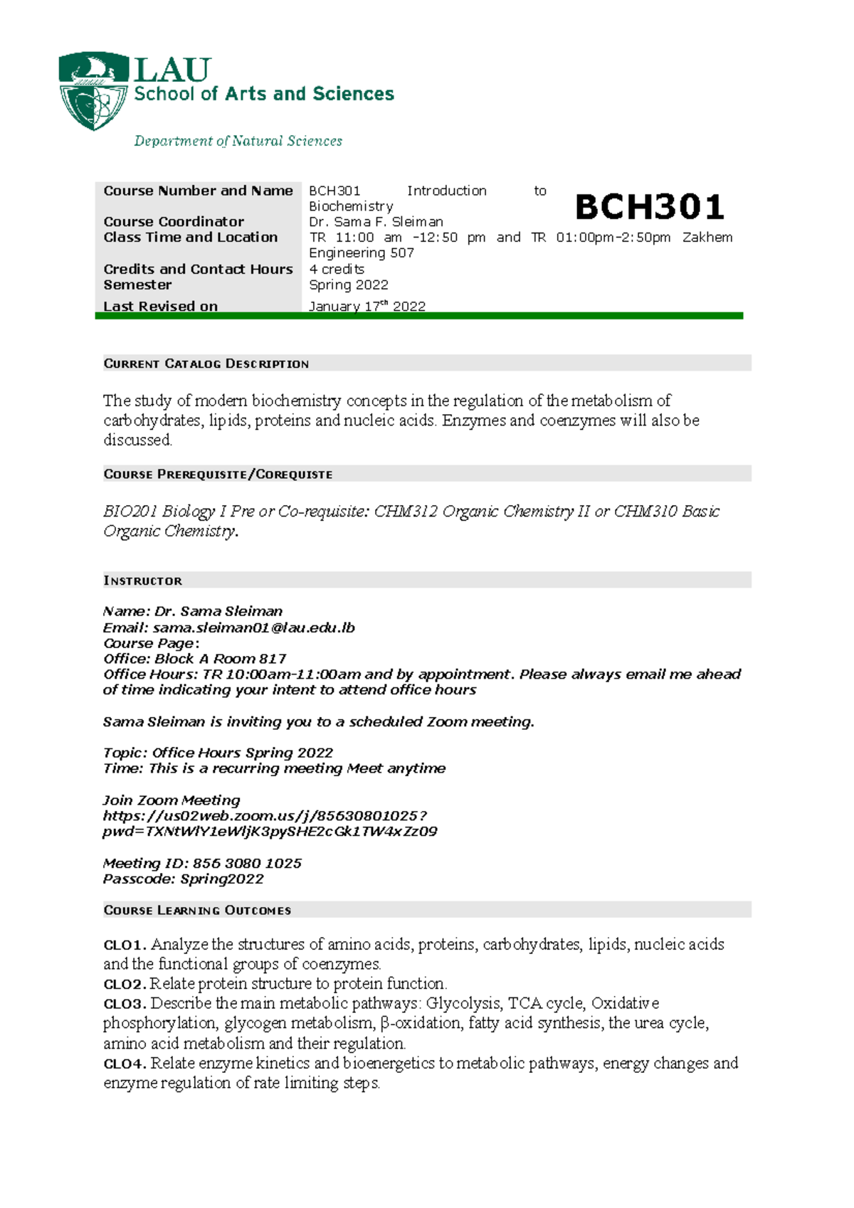 BCH301 Syllabus Spring 2022 Course Number and Name BCH301