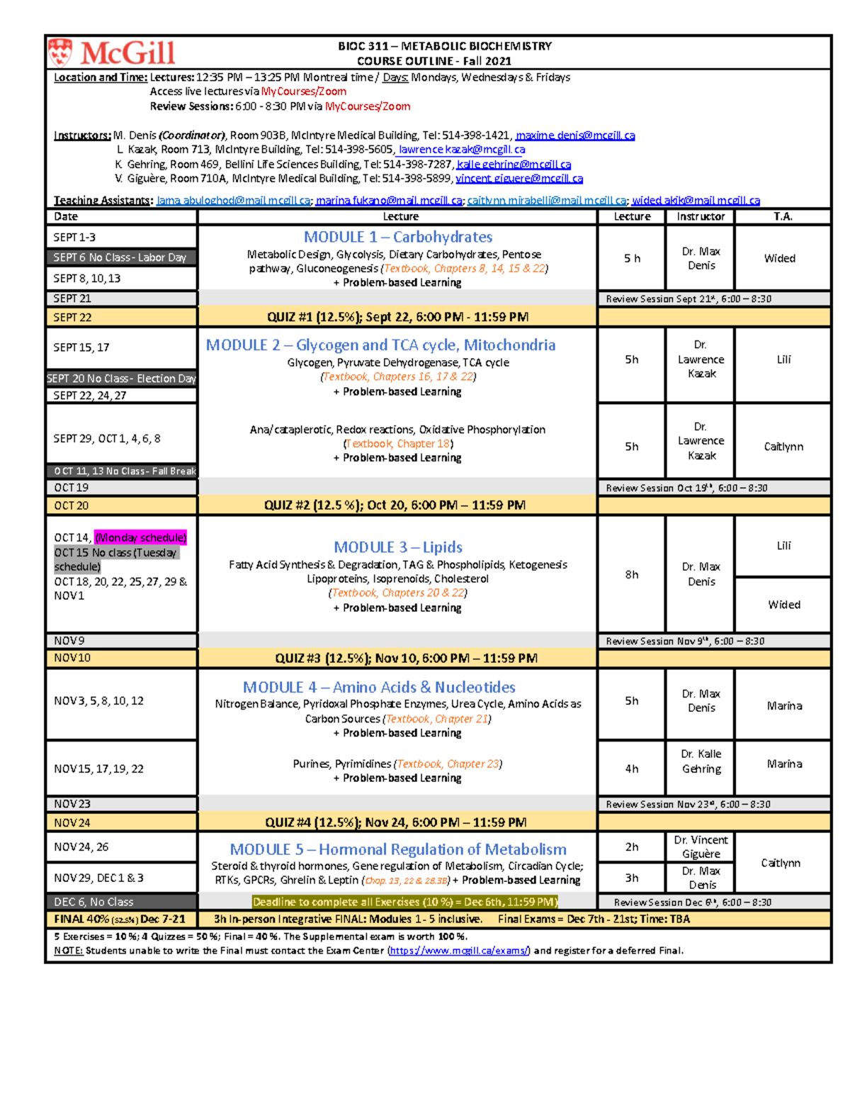 BIOC 311 Course Outline Fall 2021 BIOC 311 METABOLIC BIOCHEMISTRY
