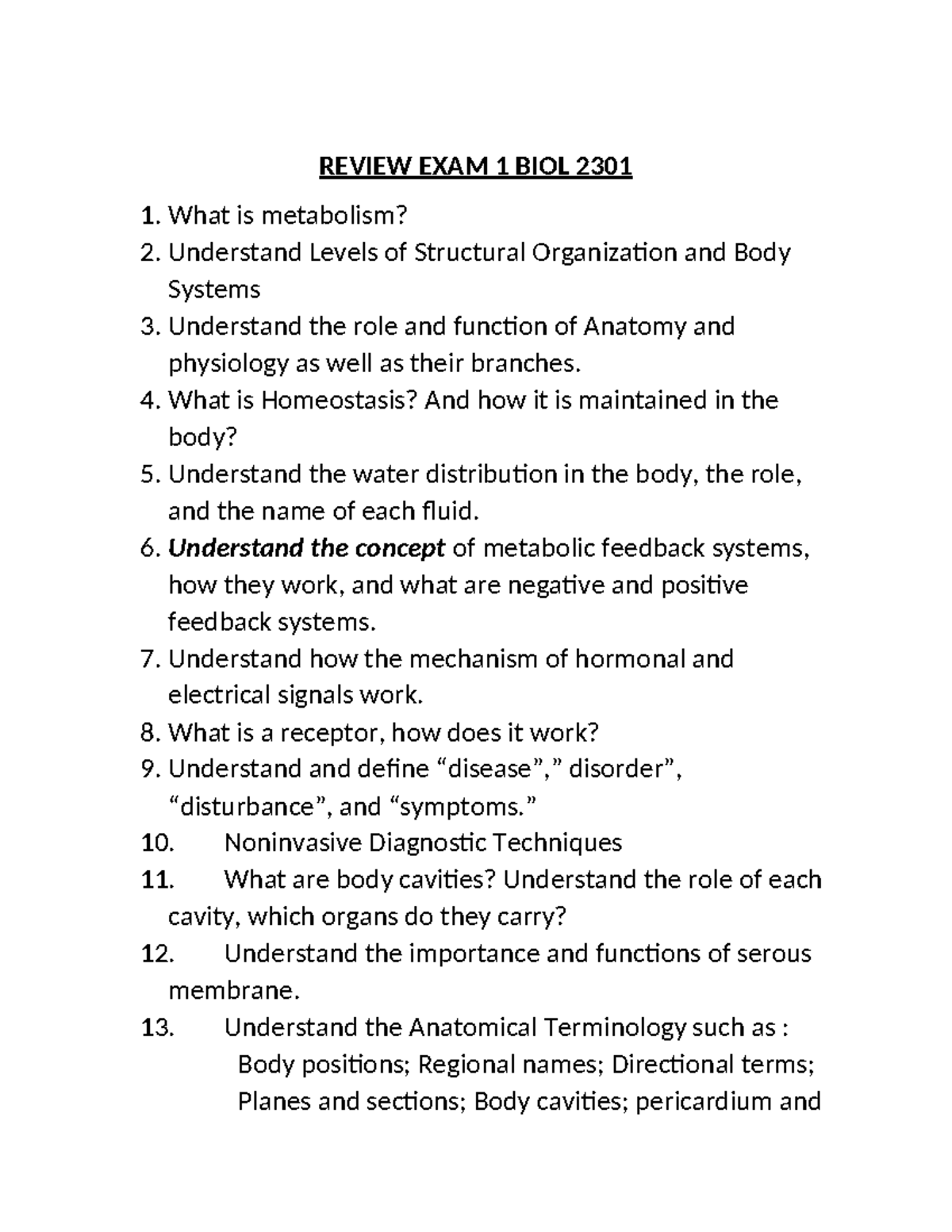 Review for Lecture Exam 1 of anatomy and physiology BIOL 2301 Review
