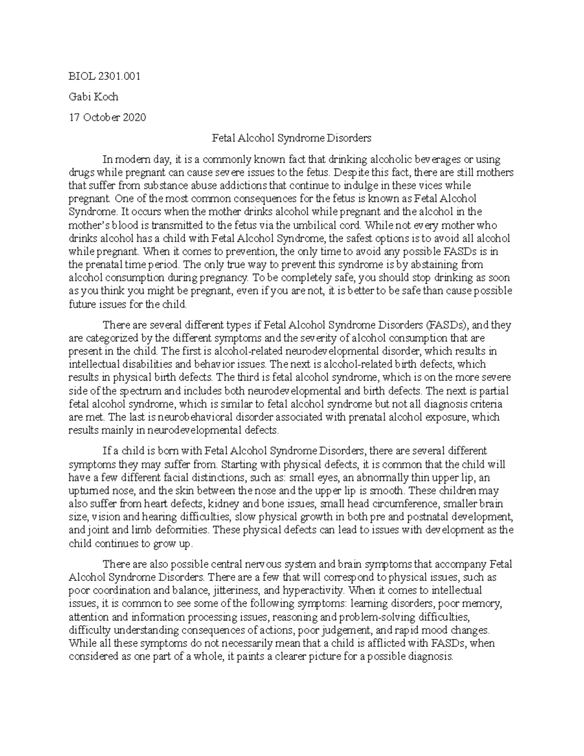 BIOL2301 Paper 2 BIOL 2301. Gabi Koch 17 October 2020 Fetal Alcohol