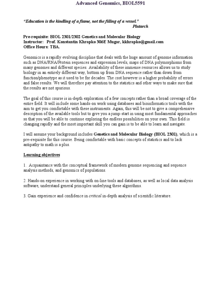 PreRequisite BIOL 2301/2302 and Molecular Biology Office