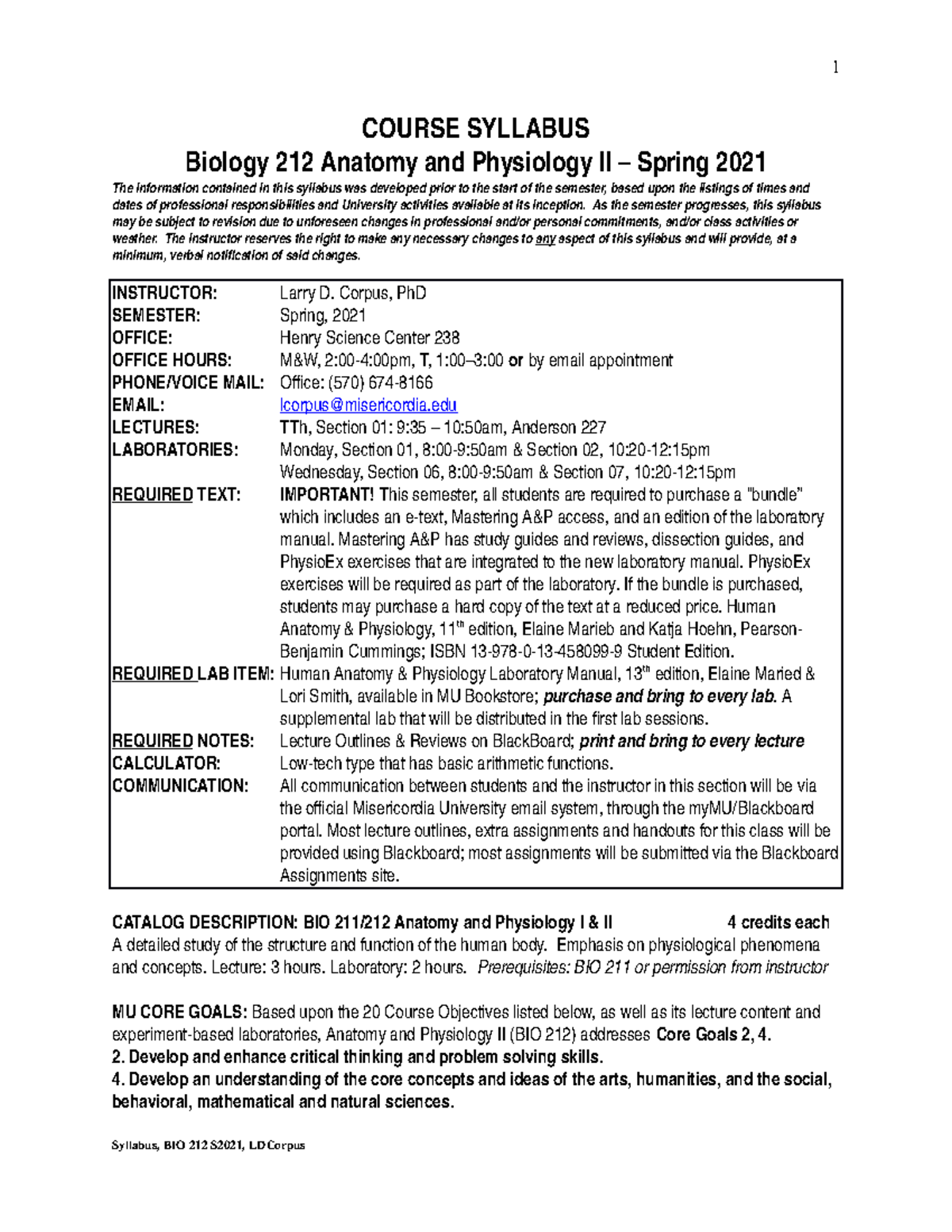 Syllabus BIO21201 corpus 2020SP COURSE SYLLABUS Biology 212 Anatomy