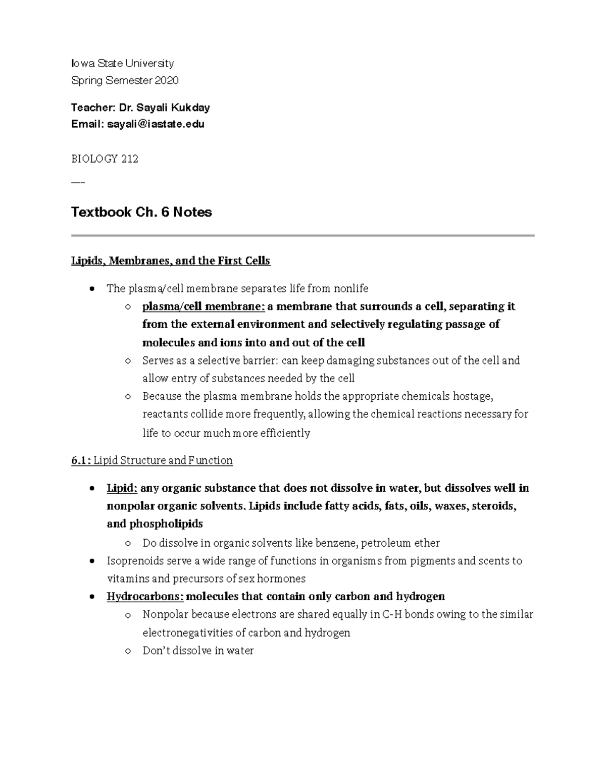 Bio. 212 Ch. 6 Notes Iowa State University Spring Semester 2020