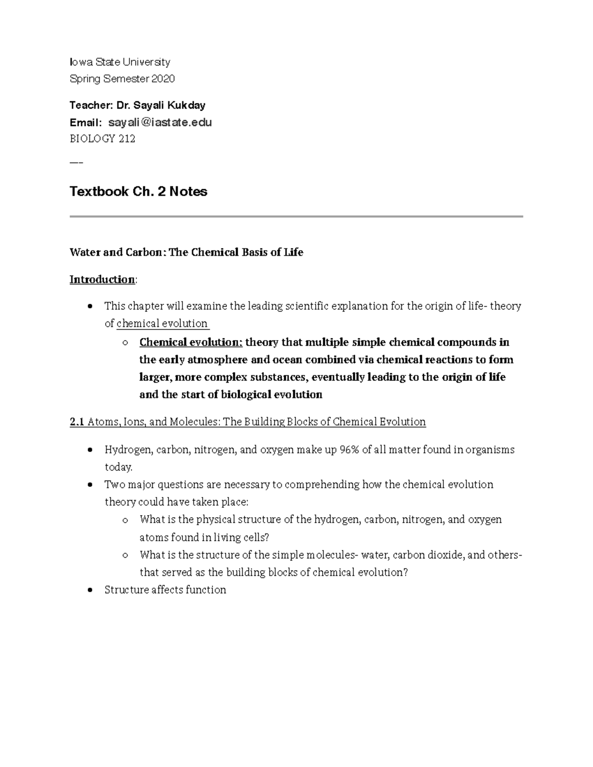 Bio. 212 Ch. 2 Notes Dr. Sayali Kukday Iowa State University Spring