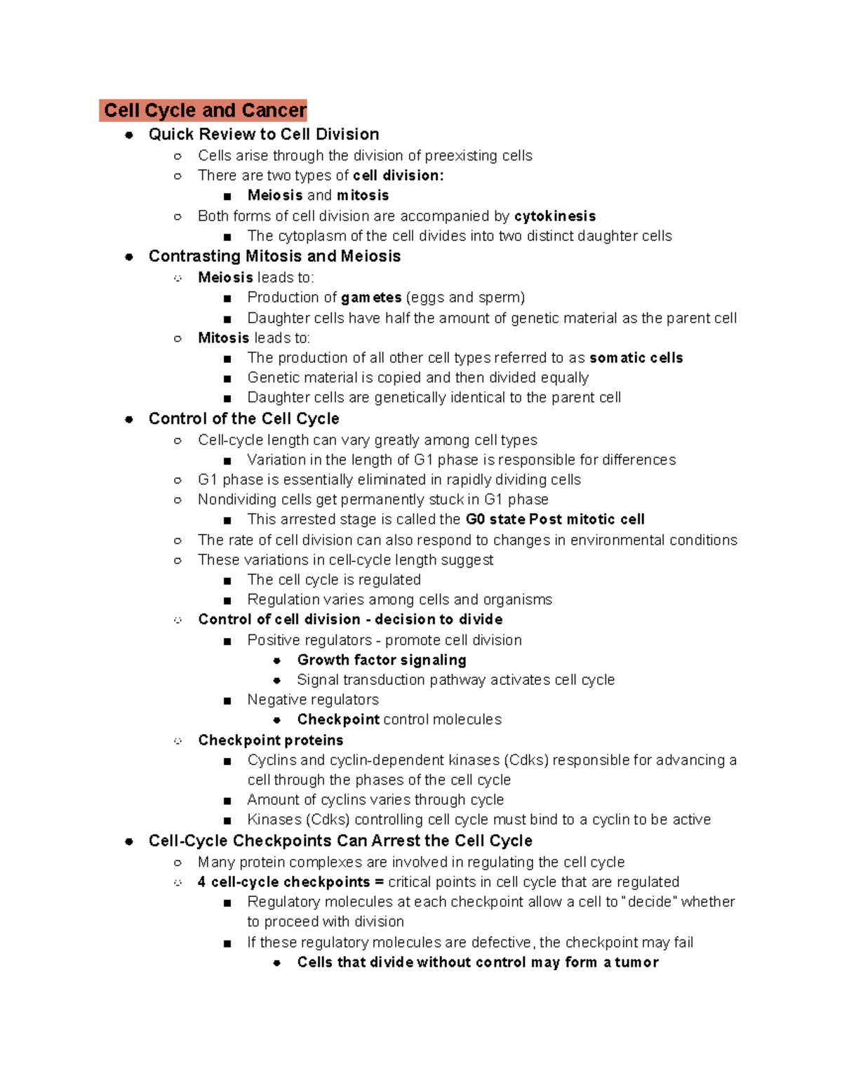 Bio 212 Principles of Biology II Cell Cycle and Cancer Quick Review