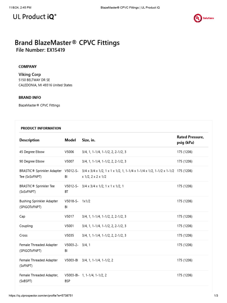 BlazeMaster® Viking CPVC Fittings UL Product Iq PDF