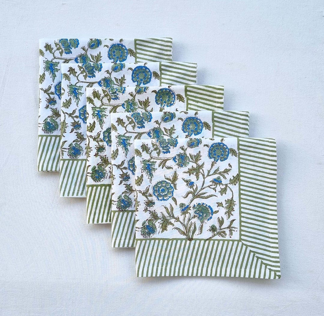 Grass Green and Blue Indian Floral Block Print Napkin, Handmade Cotton