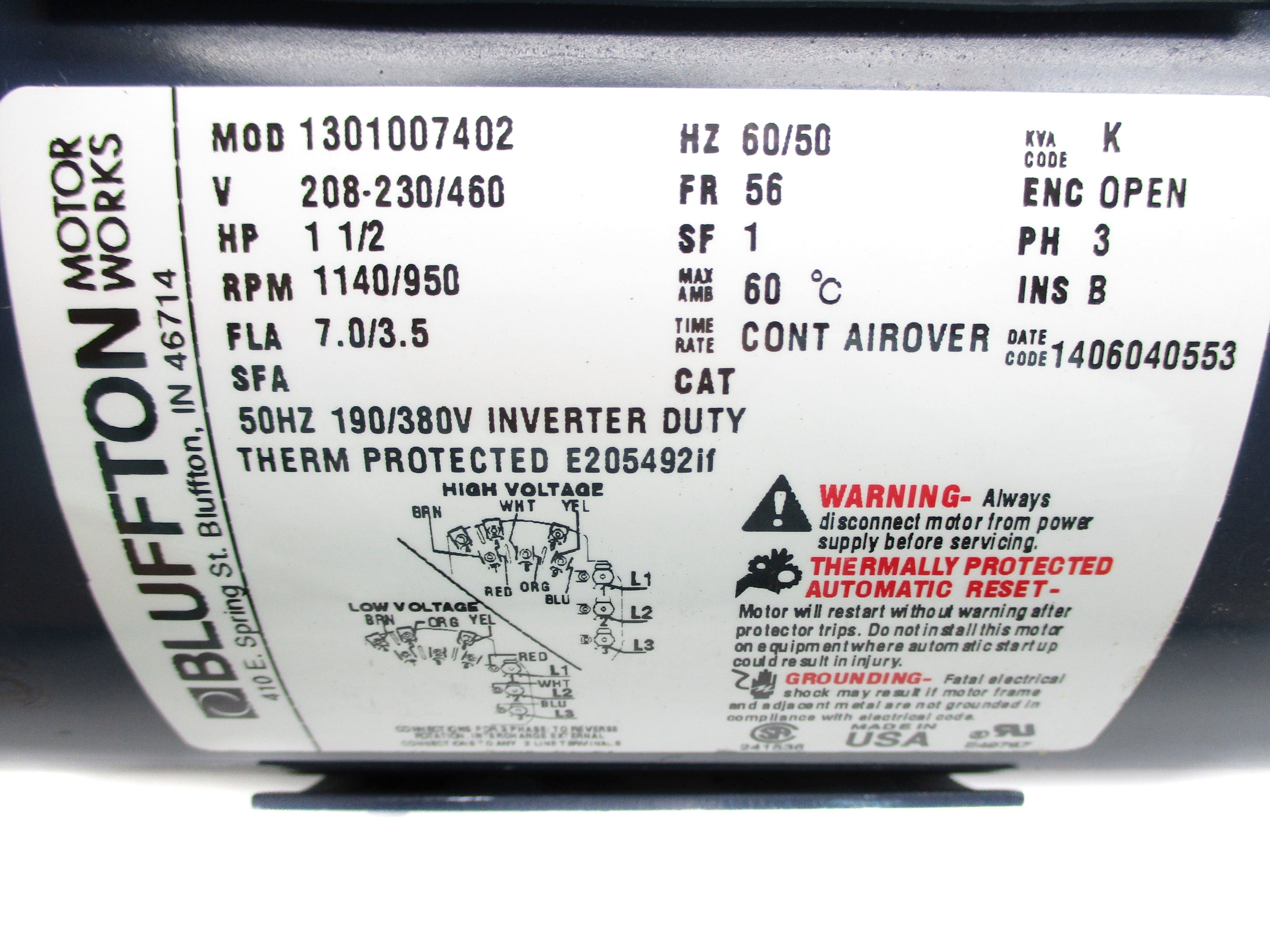 BLUFFTON MOTOR WORKS MOTOR 1311017113 1725/1425 RPM 2.0 HP 50/60hz eBay