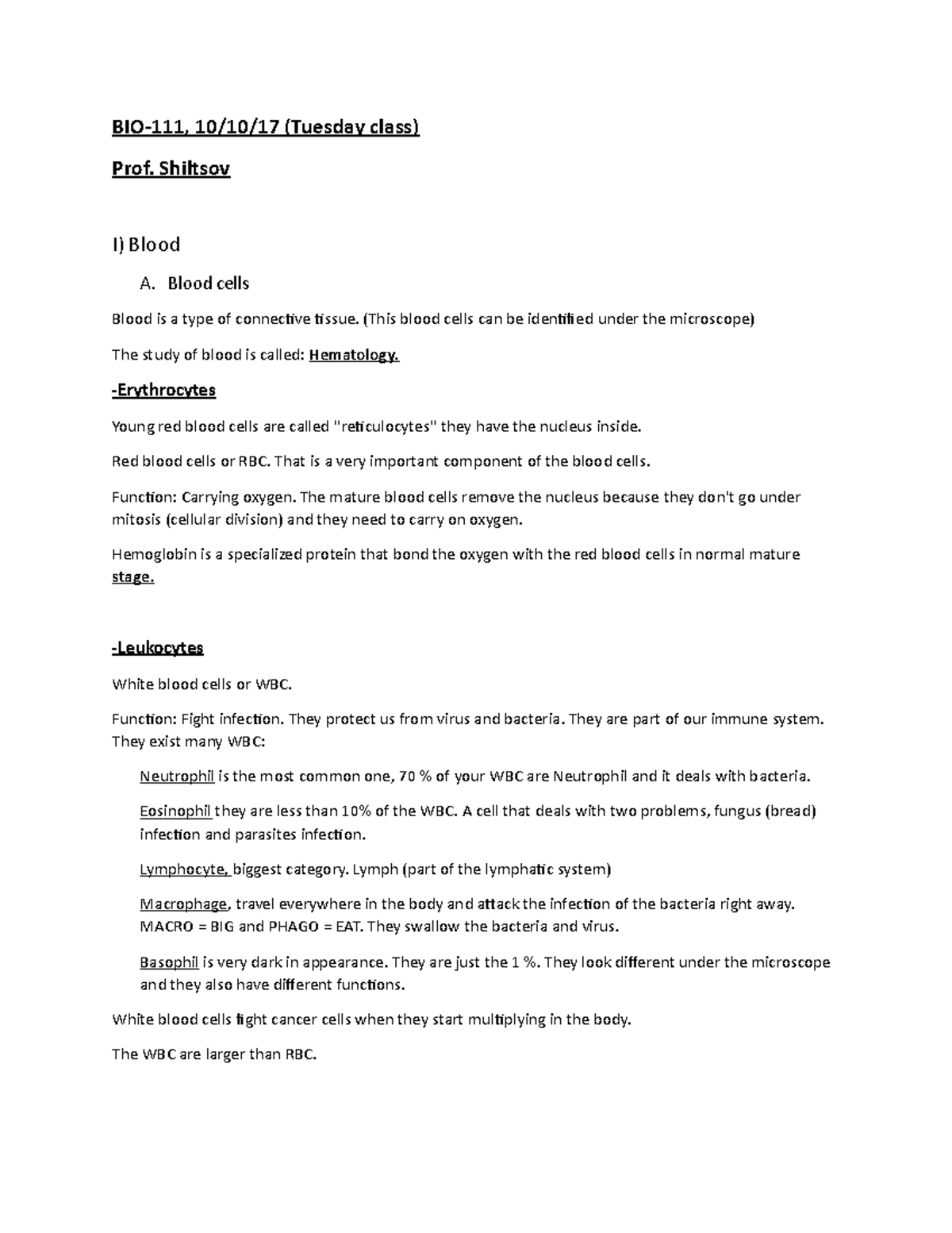 BIO111 OCT 10 BIO 111 Lectures notes. Prof. Shiltsov. BMCC. Fall