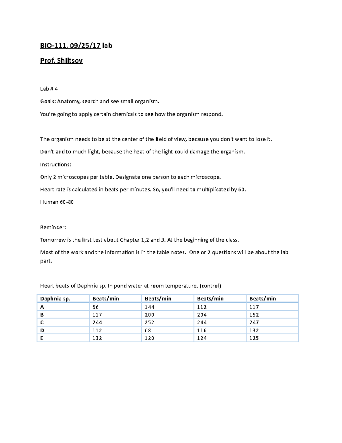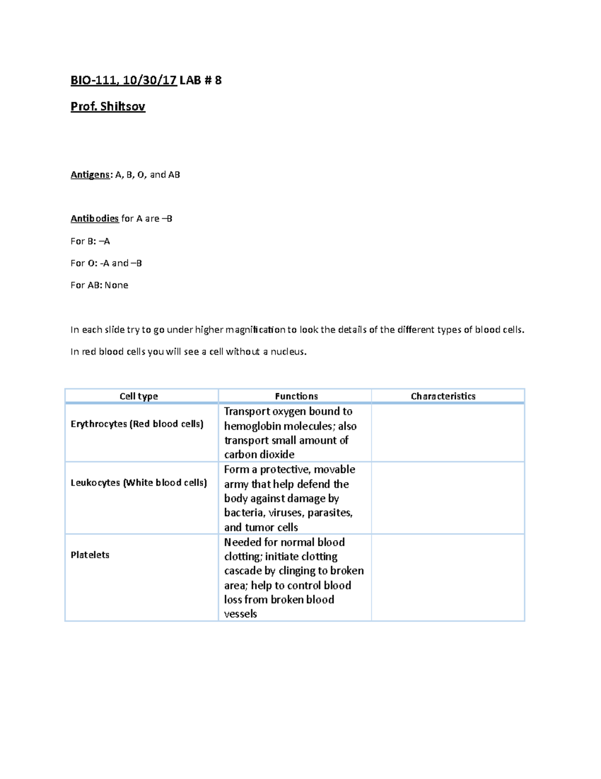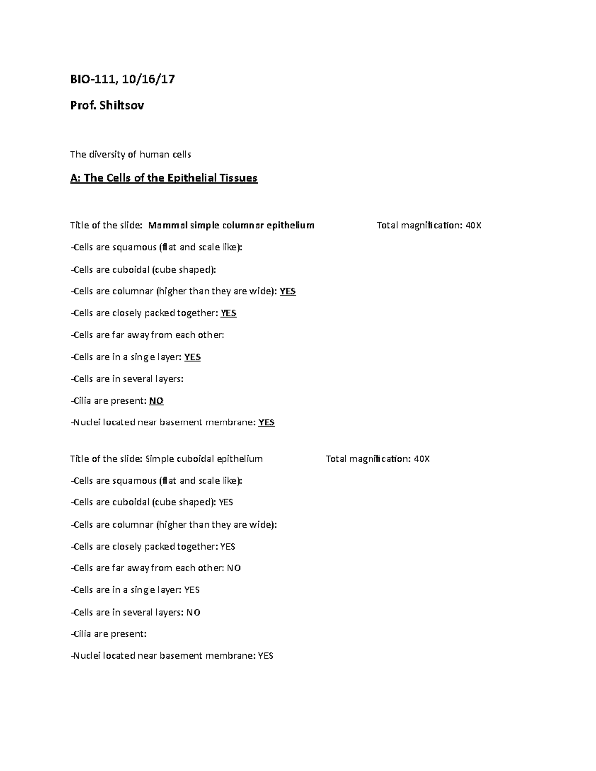 BIO111 OCT 16 BIO 111 lab notes. Prof. Shiltsov. BMCC. Fall 2017
