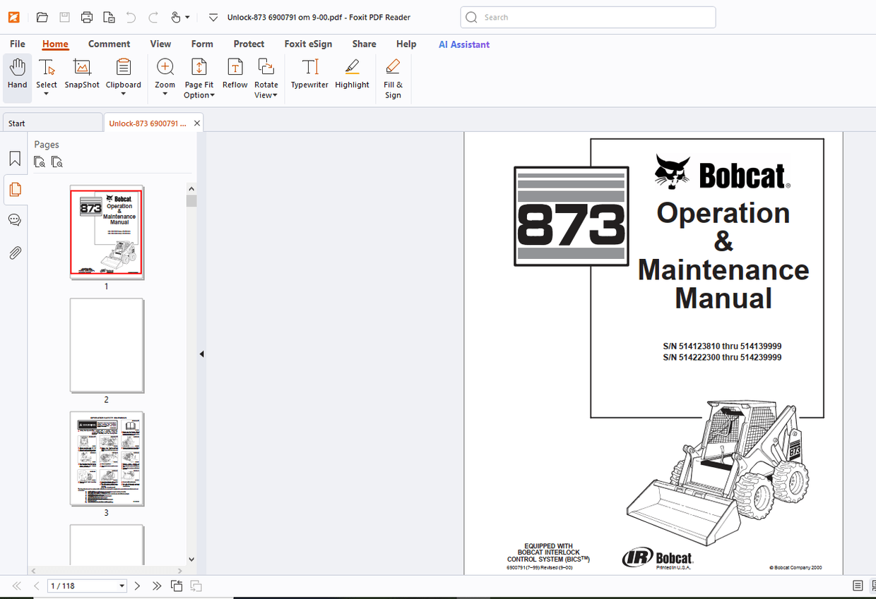 Bobcat 873 Operation & Maintenance Manual PDF DOWNLOAD