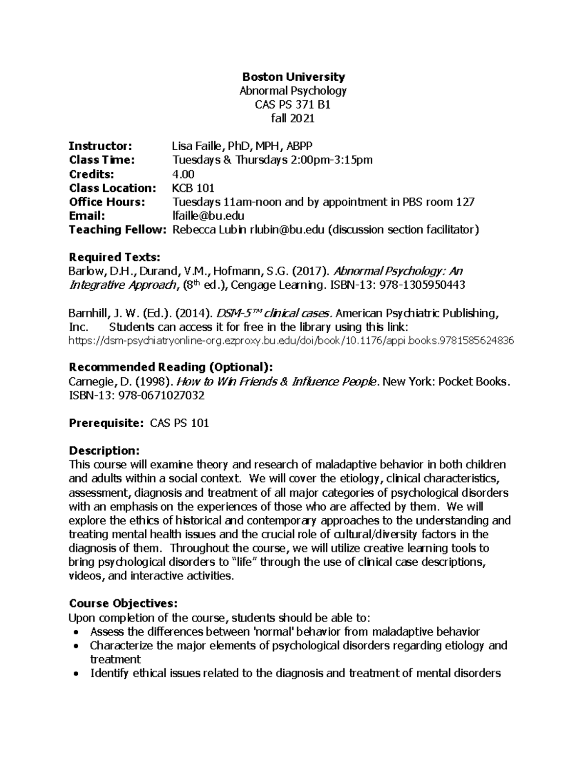 Syllabus 2021 Boston University Abnormal Psychology CAS PS 371 B fall