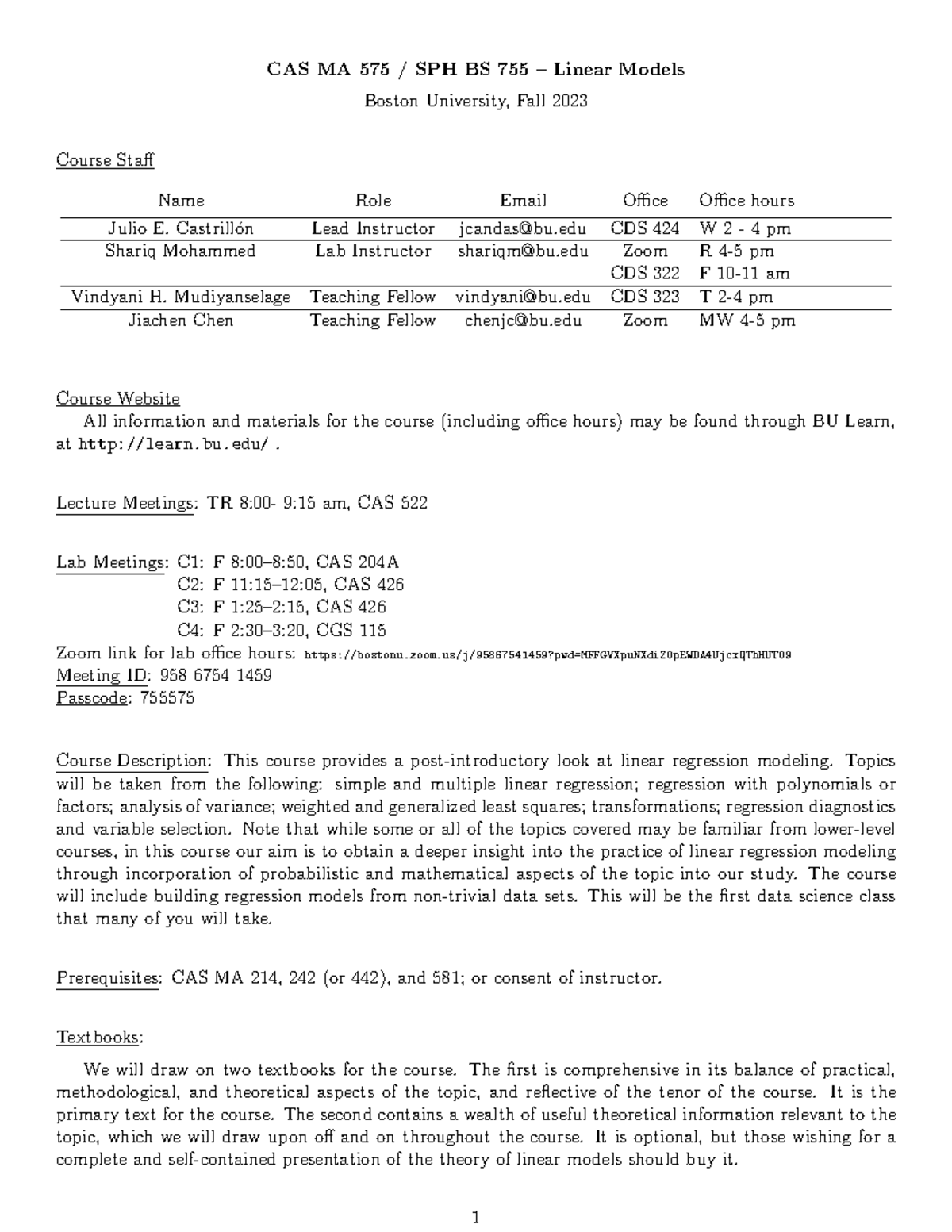 Syllabus575 Summary Linear Models CAS MA 575 / SPH BS 755 Linear