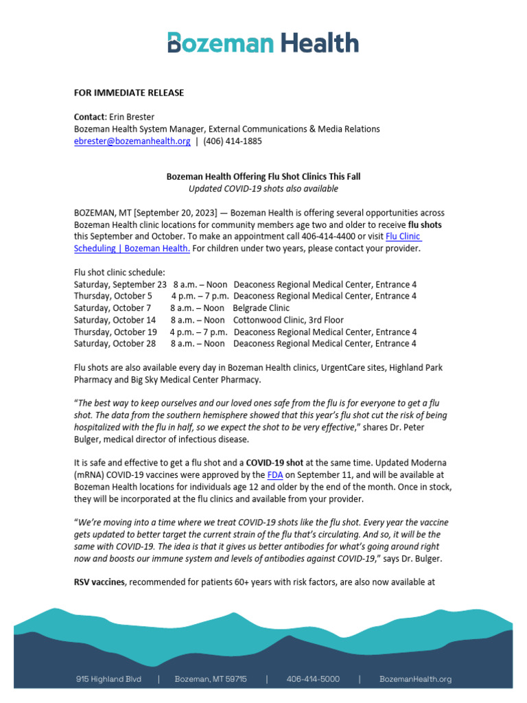 BH News Release Bozeman Health Offering Flu Shot Clincs This Fall