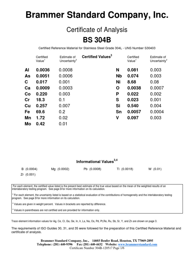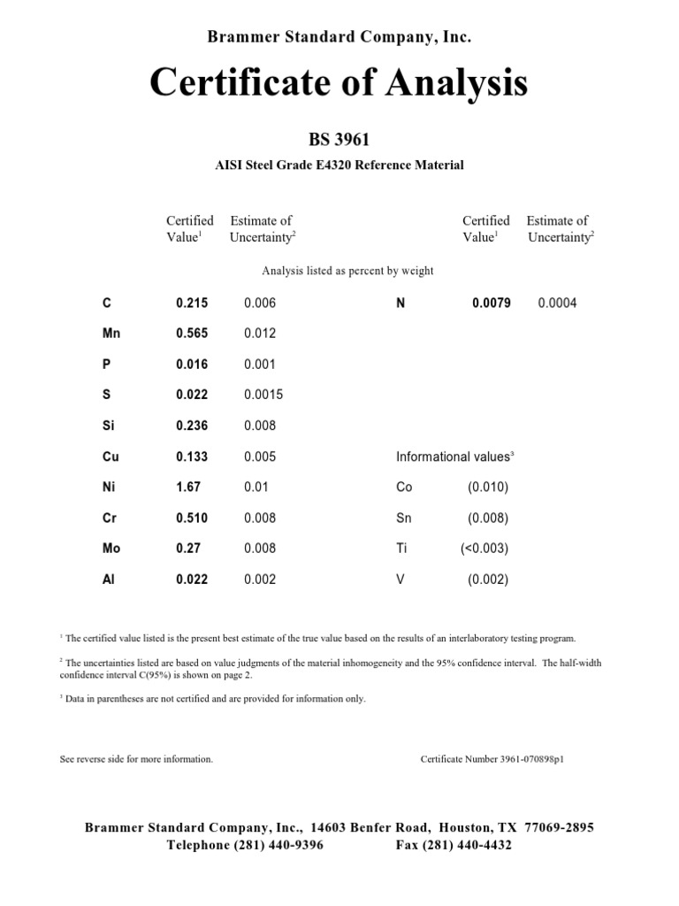 Brammer Standard Company, Inc. Certificate of Analysis PDF
