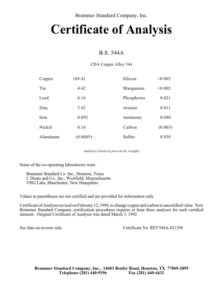 Certificate of Analysis Brammer Standard Company, Inc PDF Copper