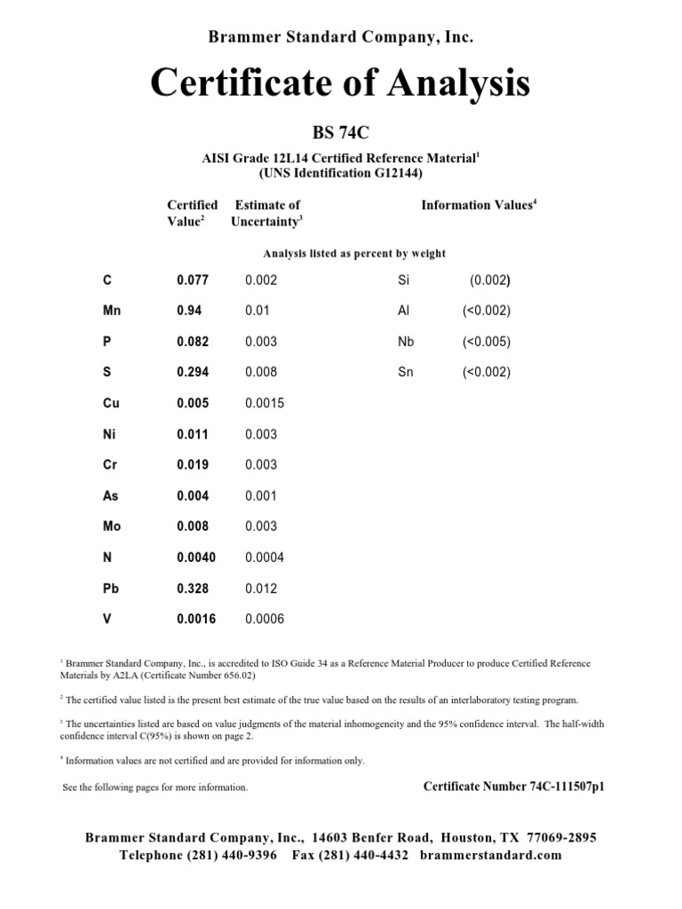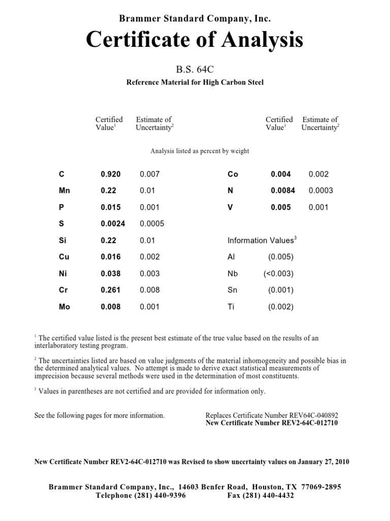 Brammer Standard Company, Inc. Certificate of Analysis PDF
