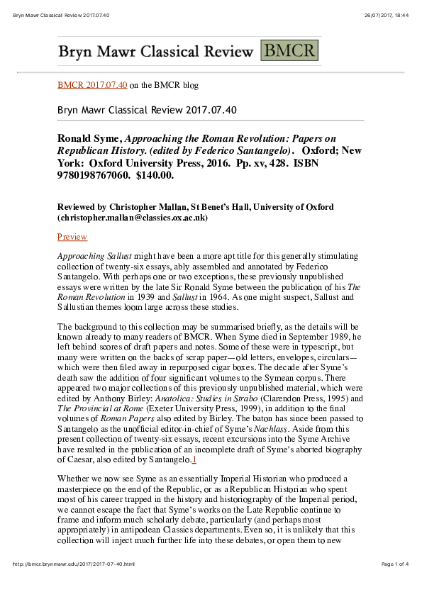 (PDF) Review of R. Syme (ed. F. Santangelo) Approaching the Roman