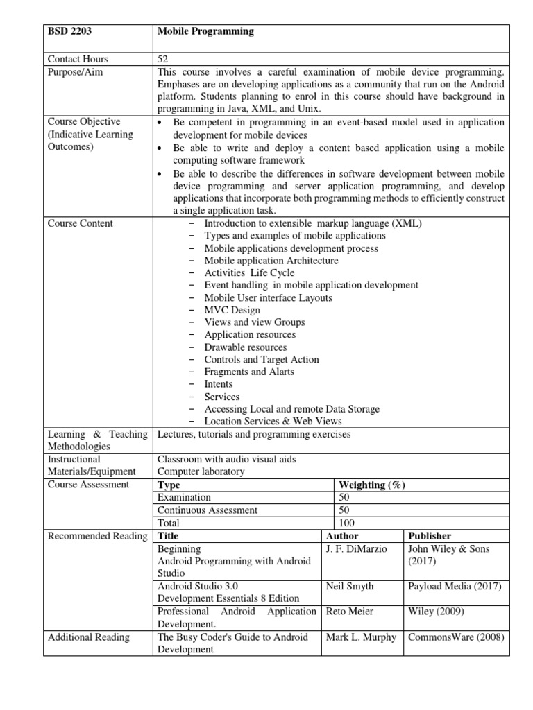 BSD 2203 Mobile Programming Course Outline PDF Mobile App Android