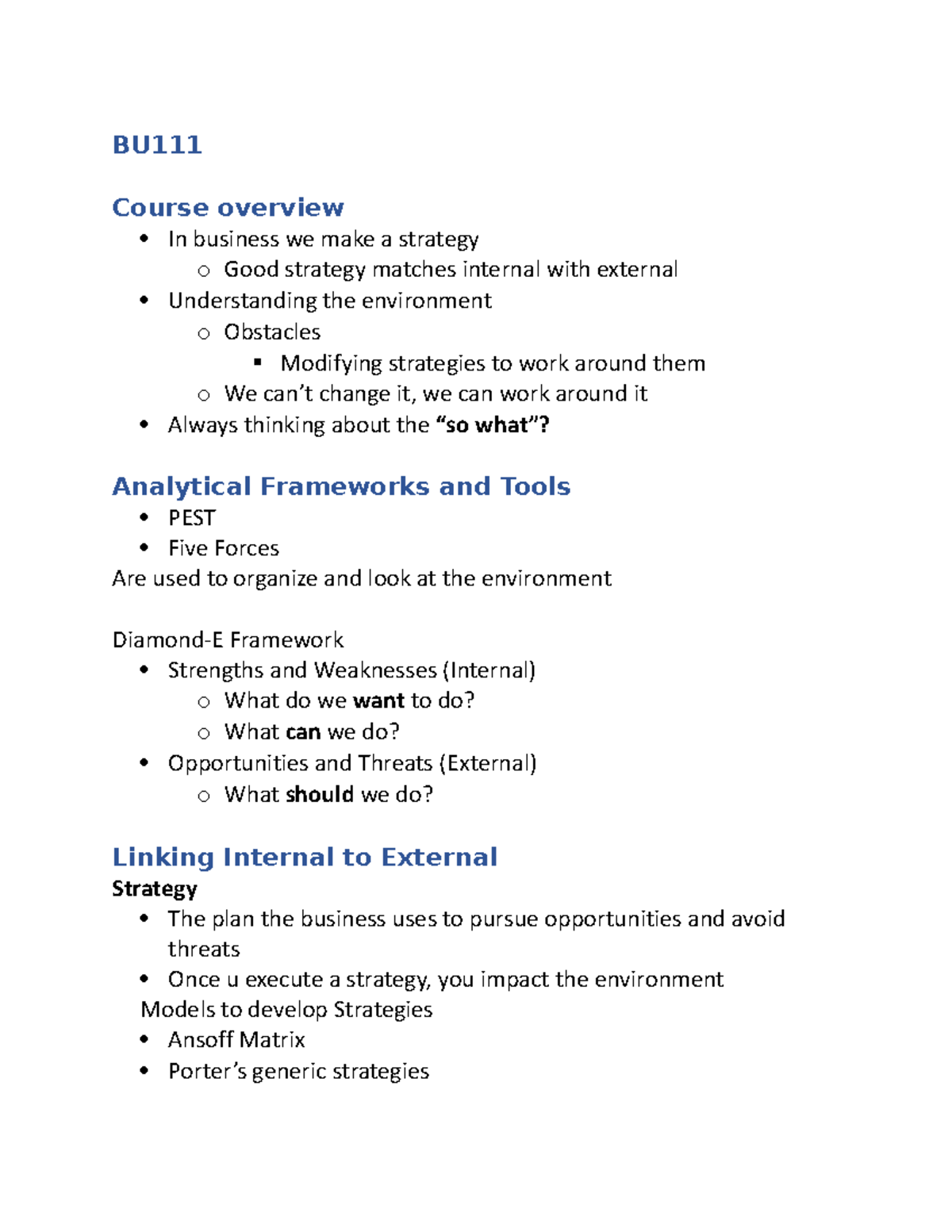 Key Success Factors & Strategic Analysis Models BU Course overview In