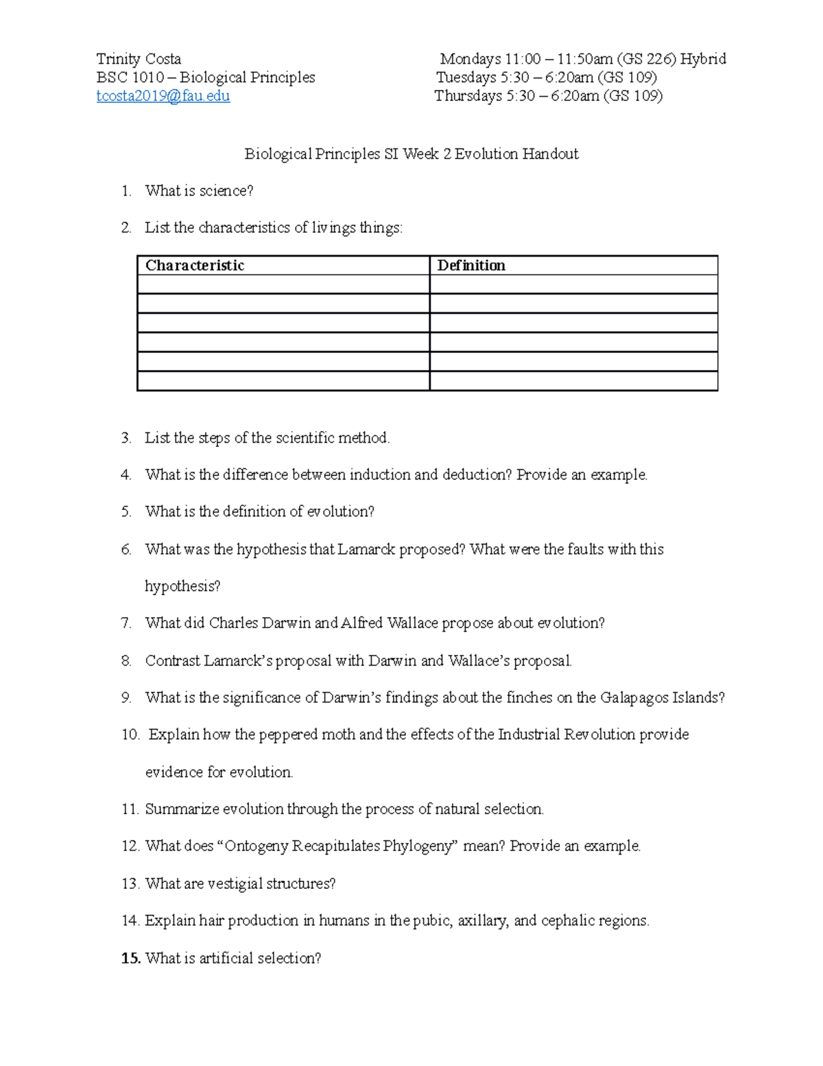 Biological Principles SI Week 2 Evolution Handout Trinity Costa