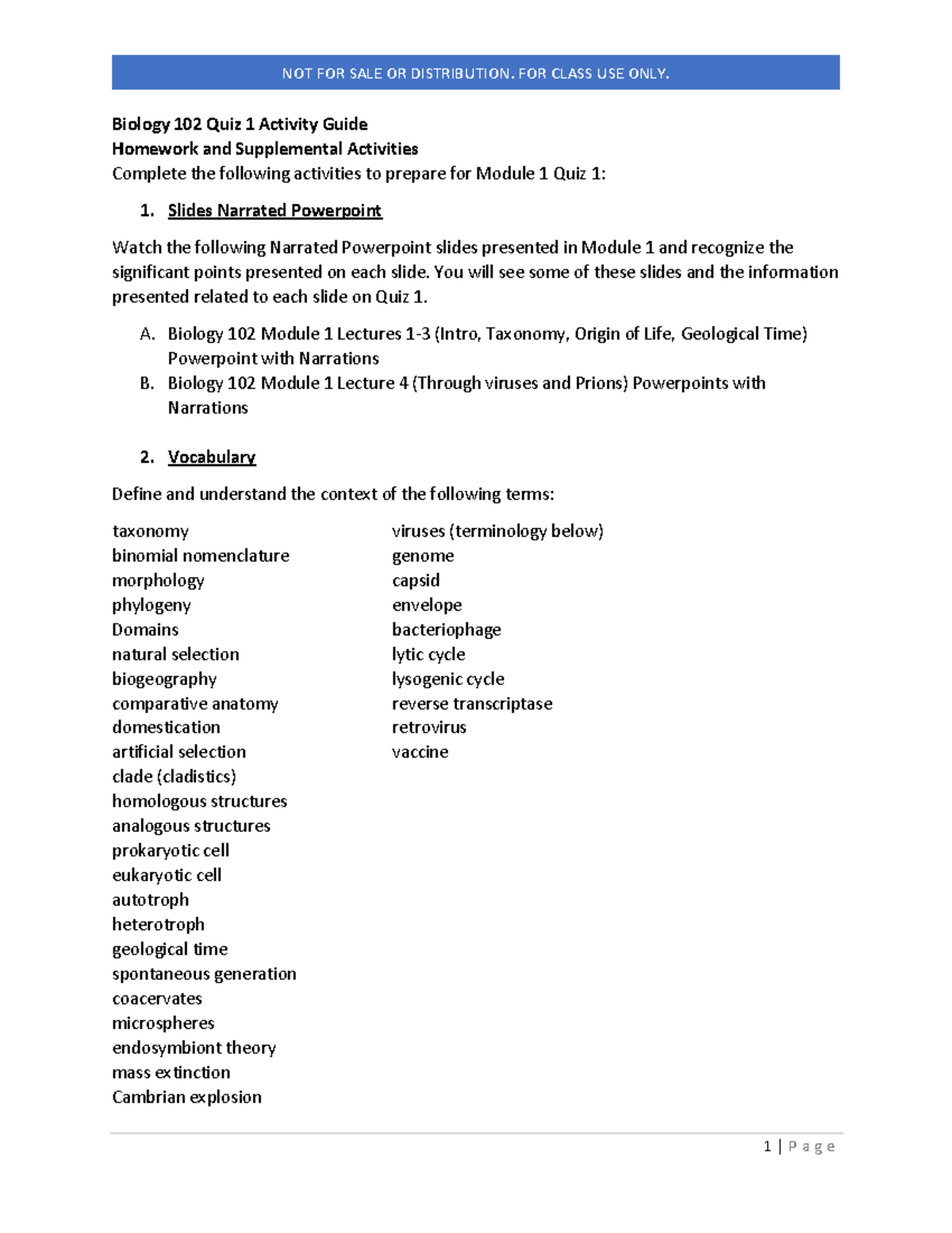 Biology 102 Quiz 1 Activity Guide Revised Fall 2023 Biology 102 Quiz