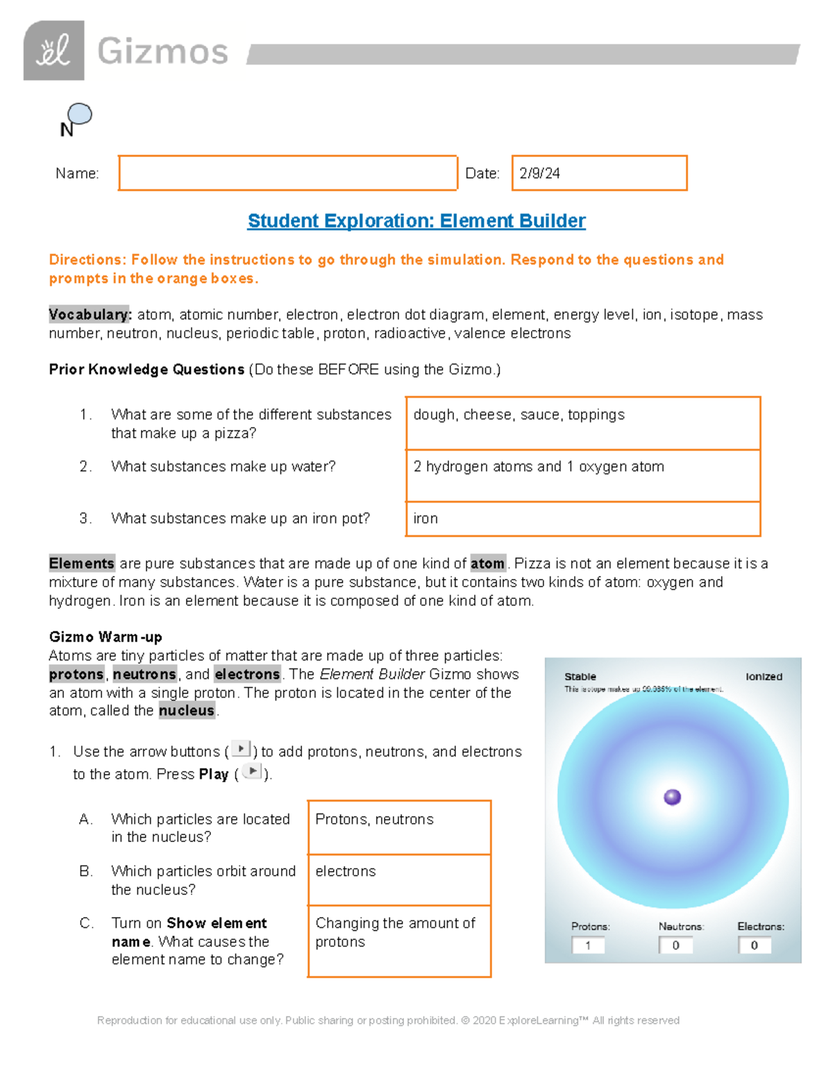 Element Builder Gizmo Name Date 2/9/ Student Exploration Element
